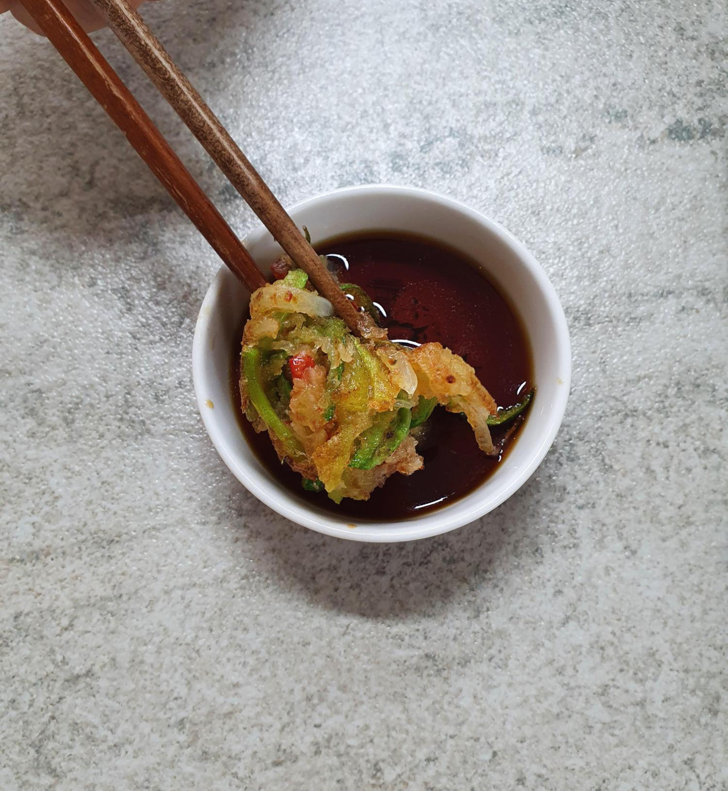또한 위에서 말씀드린 청양고추가 살짝씩 매콤하게 혀를 자극해주어서 부침개 특유의 느끼함을 1도 없이 잡아줍니다~ 애호박의 맛이 양파의 달큼함과 새우의 고소함과 같이 어우러지니 맛있네요~