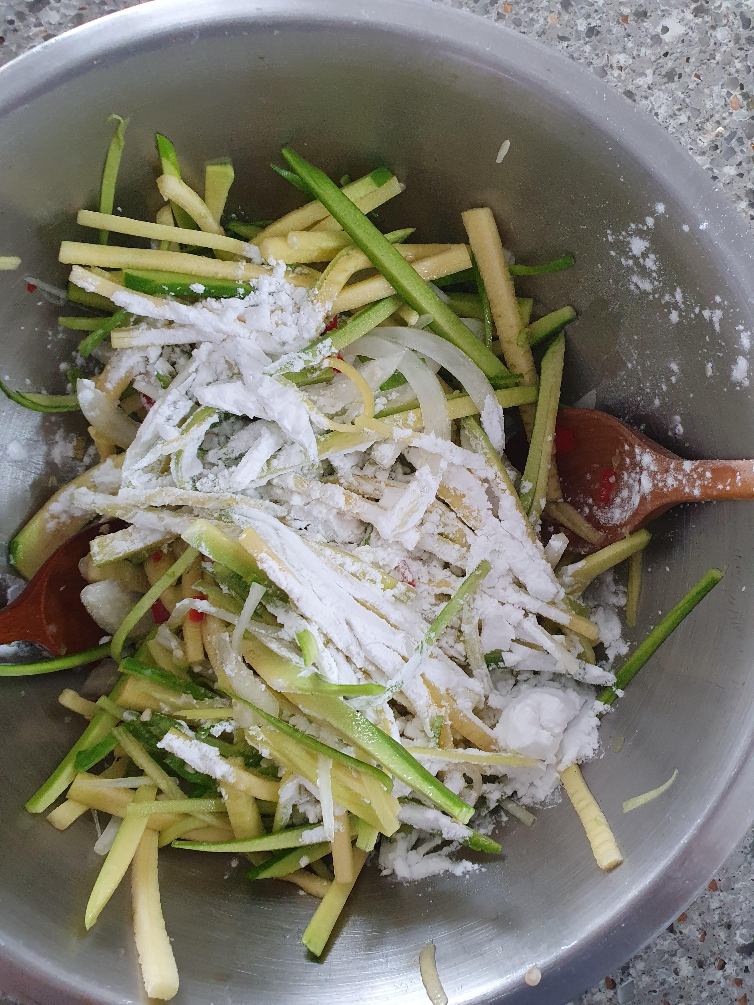 밀가루를 사용하지 않고 전분을 사용하는 게 특징인데요. 채 썬 야채들을 구워 낼 때 옹기종기 밀집시켜주는 역할을 하는 전분입니다. 너무 많이 넣으면 전분이 투명해지면서 끈 쩍 끈적 해 지니 야채들이 살짝 전분가루에 입혀지도록 해주어야 합니다. 저와 같은 양을 하는 경우 수저로 6스푼 정도 넣으니 적당하게 섞이는 모습이었네요. 참고해 주세요.