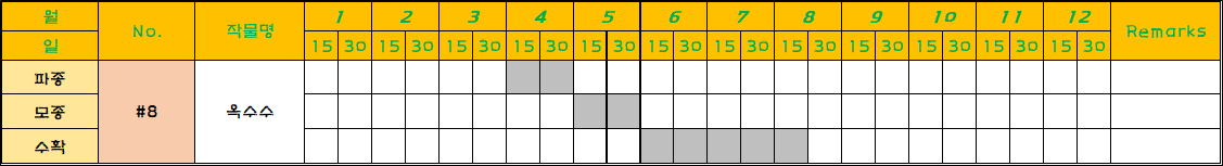 파종을 할 경우에는 4월 초부터 실내에서 준비를 해야겠습니다. 연약한 옥수수는 벌레나 새들의 먹이가 될 수 있는 점 참고하셔서 떡잎을 제외한 본잎이 약 4 잎 정도 준비될 때까지 키워야 합니다.