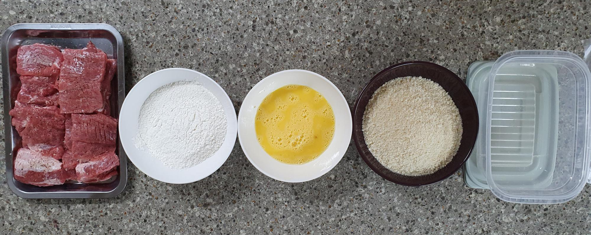 | 재료 준비 돼지고기 안심 1근 반 / 밀가루 (중력분) / 계란 3개 / 빵가루 (뚜기 1봉지) 양념 (고기 밑간 및 소스 ) 소금 / 후추 / 통깨 |