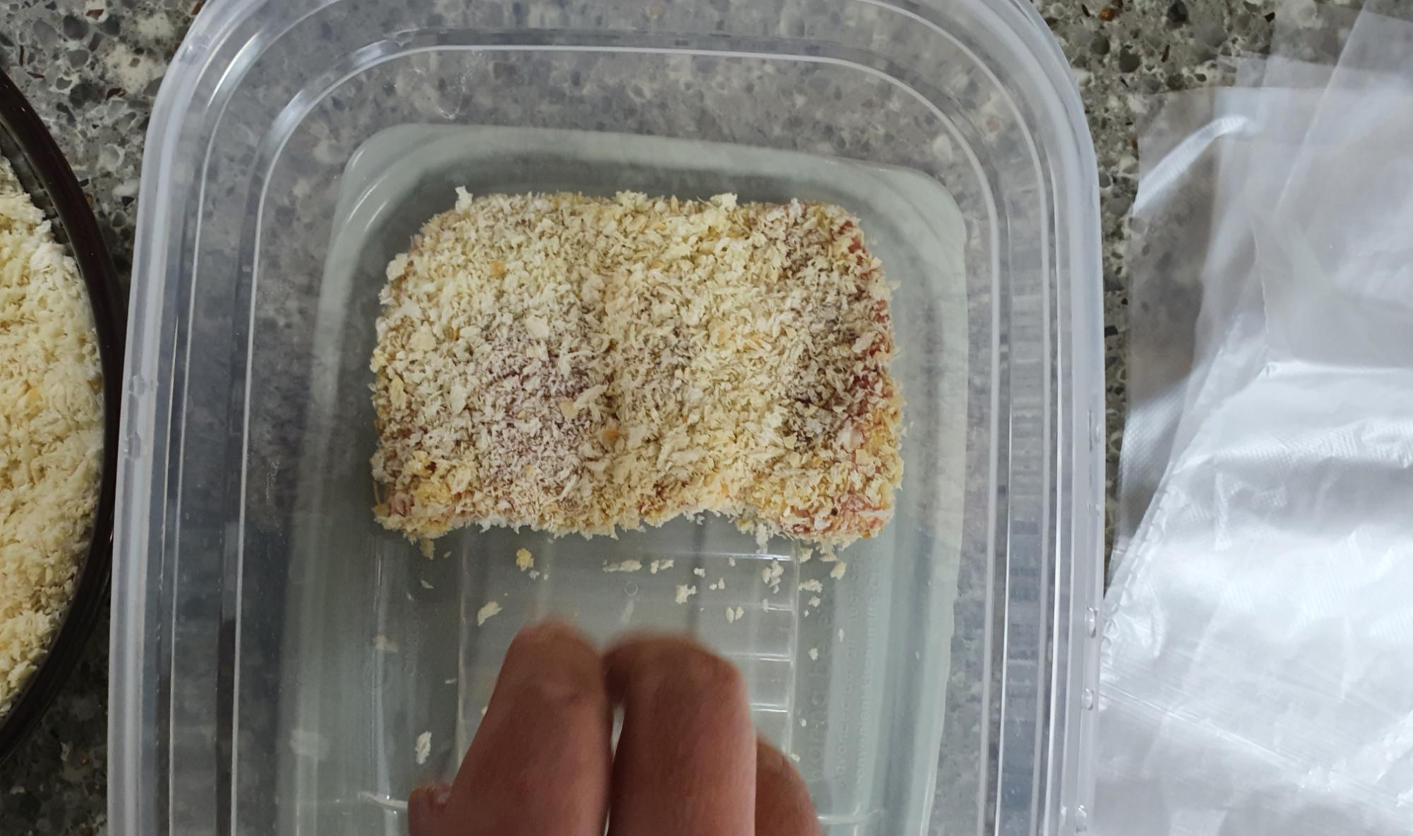 앞뒤로 뒤집어 가면서 한 번씩 눌러주시면 빵가루가 전체적으로 잘 묻어나게 됩니다. 너무 세게 누르게 되면 빵가루 자체가 으스러지면서 가루가 되니, 살짝 눌러주시는 것 참고해 주세요~!