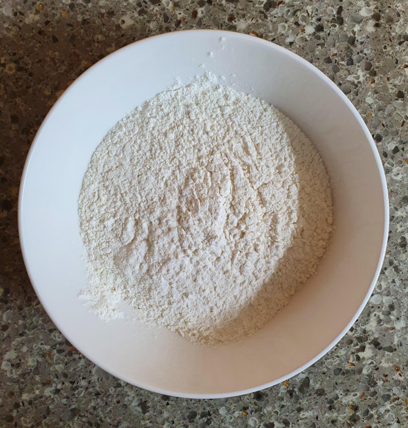 밀가루를 넓은 그릇에 덜어서 준비해 줍니다. 밀가루 종류가 많은데요. 반죽에 많이 사용하는 중력분을 이용하시면 되니 참고해 주세요. 제일 먼저 고기에 코팅하듯 감싸 줘야 하는 밀가루입니다.