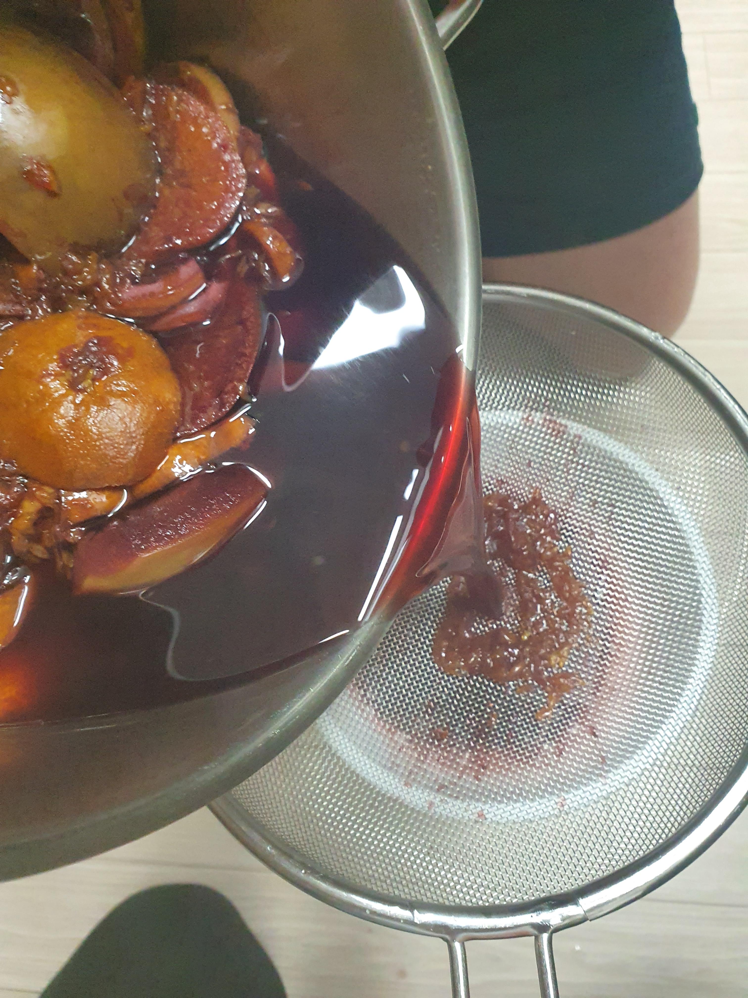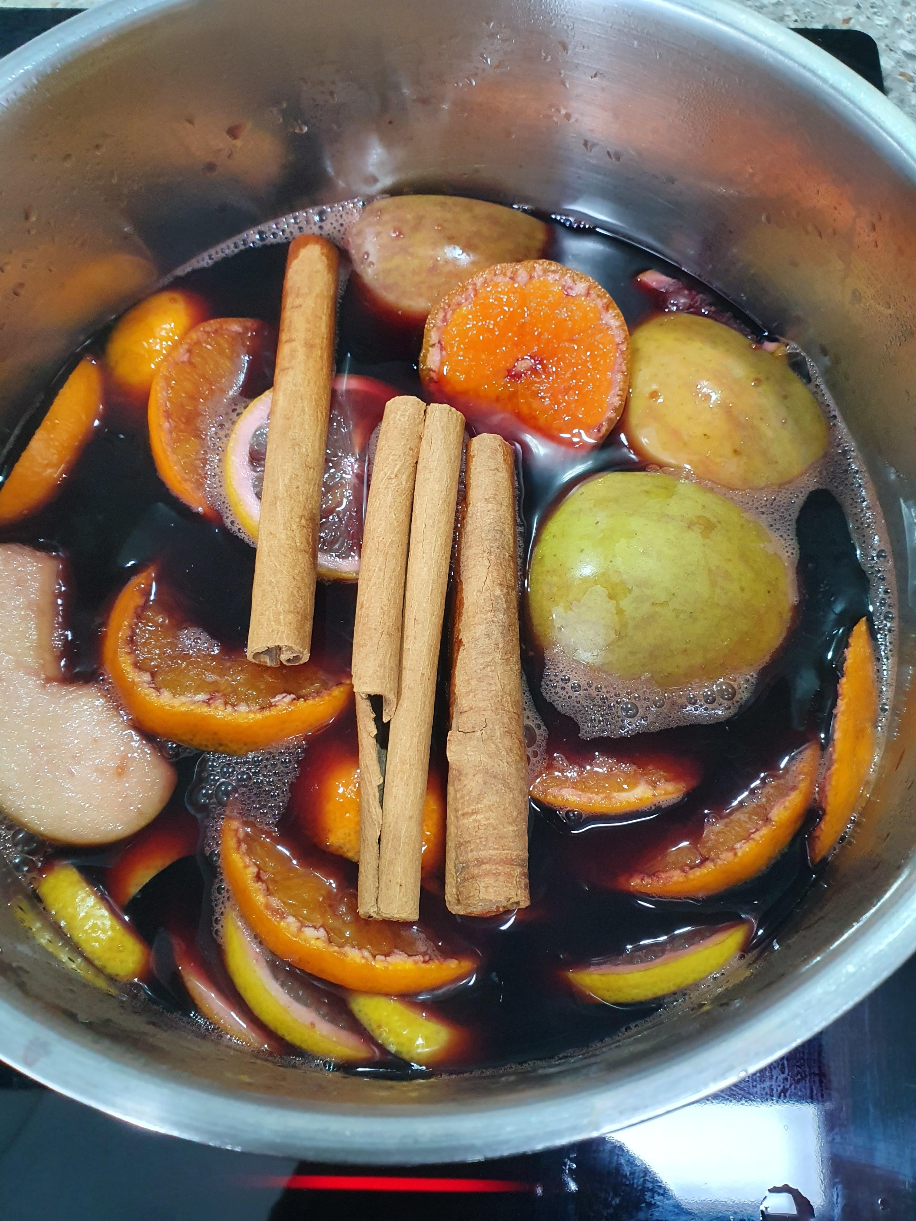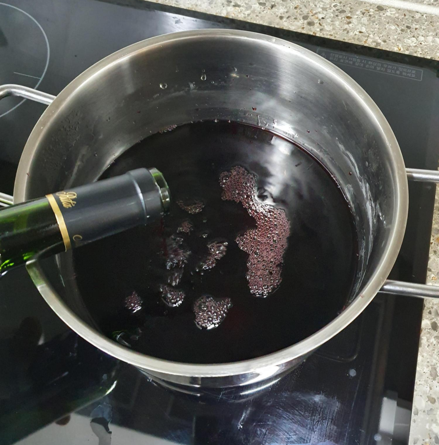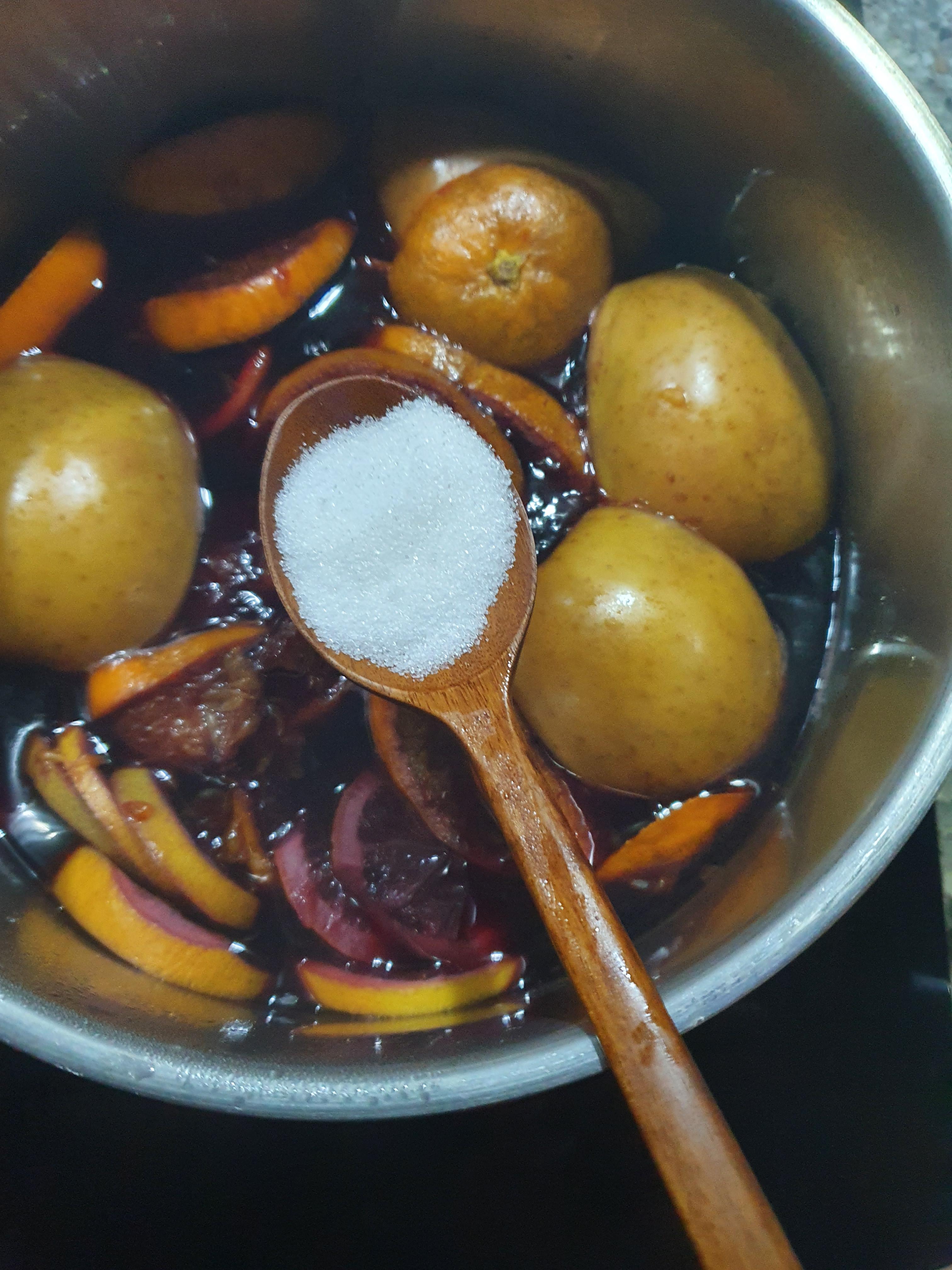 저는 설탕 한스푼을 추가로 넣어주었습니다. 과일 단맛 + 설탕 단맛 추가~^^( 씁쓸한 와인의 맛 잡기 ) 사실 단맛을 내기위한 팔각 같은 향신료가 없기 때문에 설탕으로 대체한 부분입니다. 참고해 주세요~^^