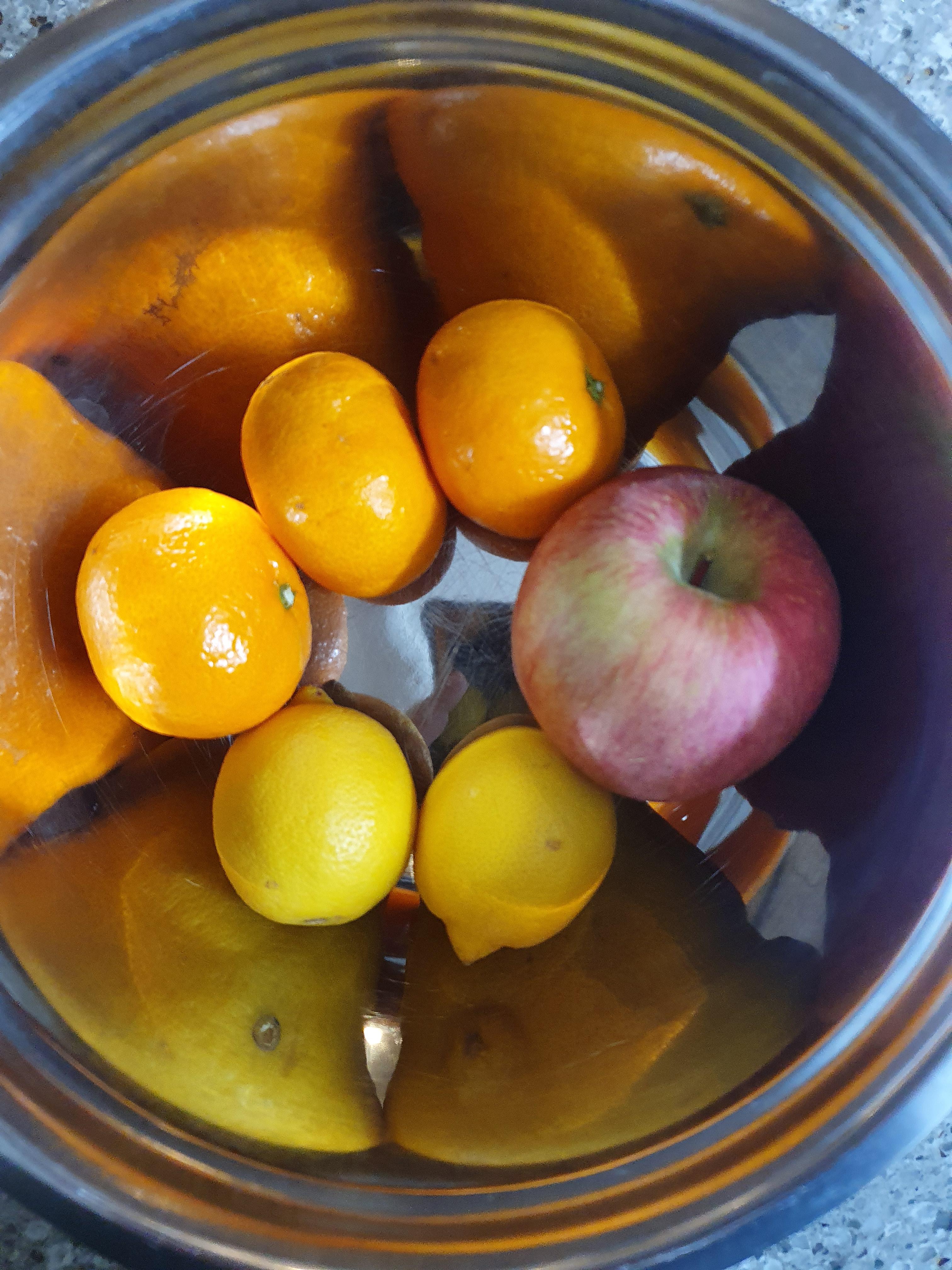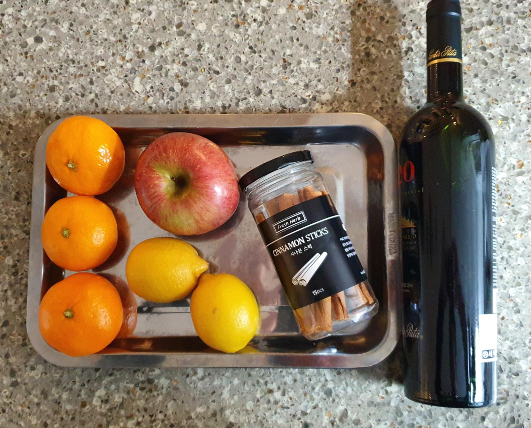 | 재료 준비 와인 750ml 1병 / 레몬 2개 / 사과 1개 / 귤 3개 (오렌지 대체용) / 계피스틱 / 설탕 & 통후추 / 꿀 과일 씻기 베이킹 소다 |